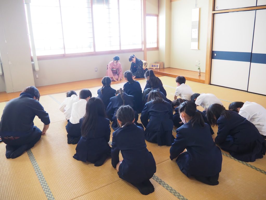 講師の先生から茶道の作法について教えていただき、お辞儀の仕方やお茶のいただき方などを実際に体験しました。