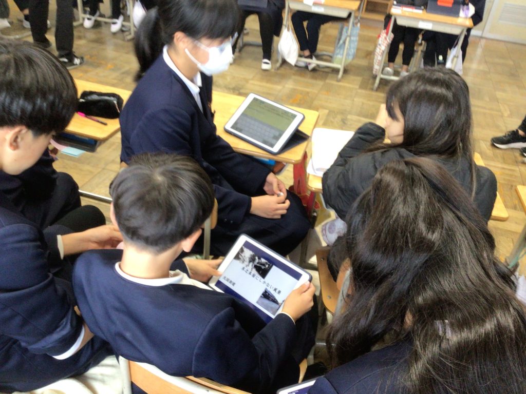 子どもたちはグループなどで協力し、iPadを見せながら木之本の魅力を積極的に説明していました。