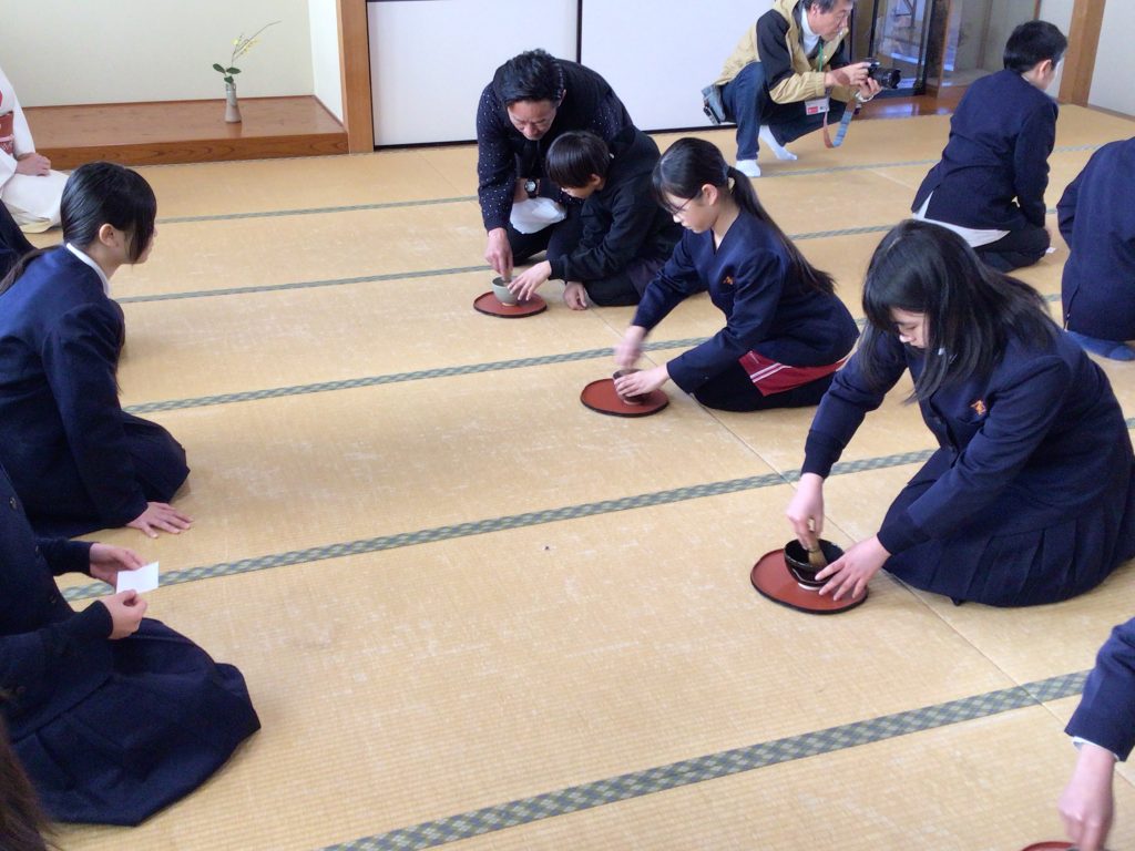 講師の先生から、礼儀作法やお茶のたて方についての指導を受けながら、集中し、真剣な態度でお茶をたてていました。
