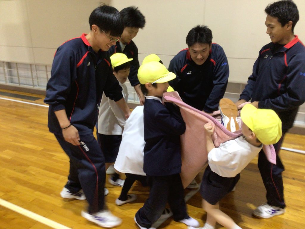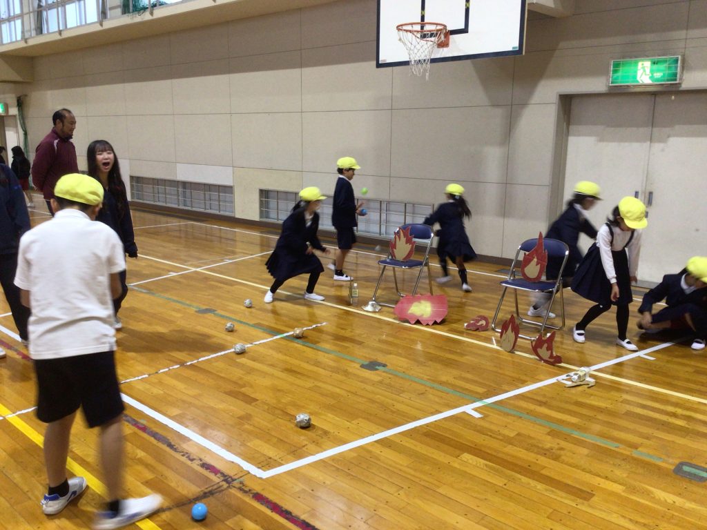 伊香高校みなさんの説明の後、子どもたちは段ボール製のキャタピラを使って、火災時に煙に巻き込まれない歩き方、毛布を使った負傷者の搬送、ボールを使って炎の的を倒す消火活動などに、楽しみながら取り組んでいました。