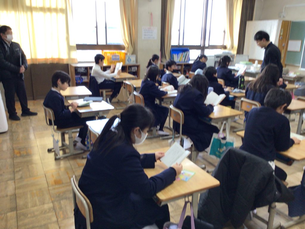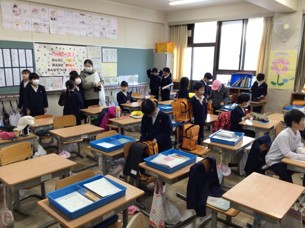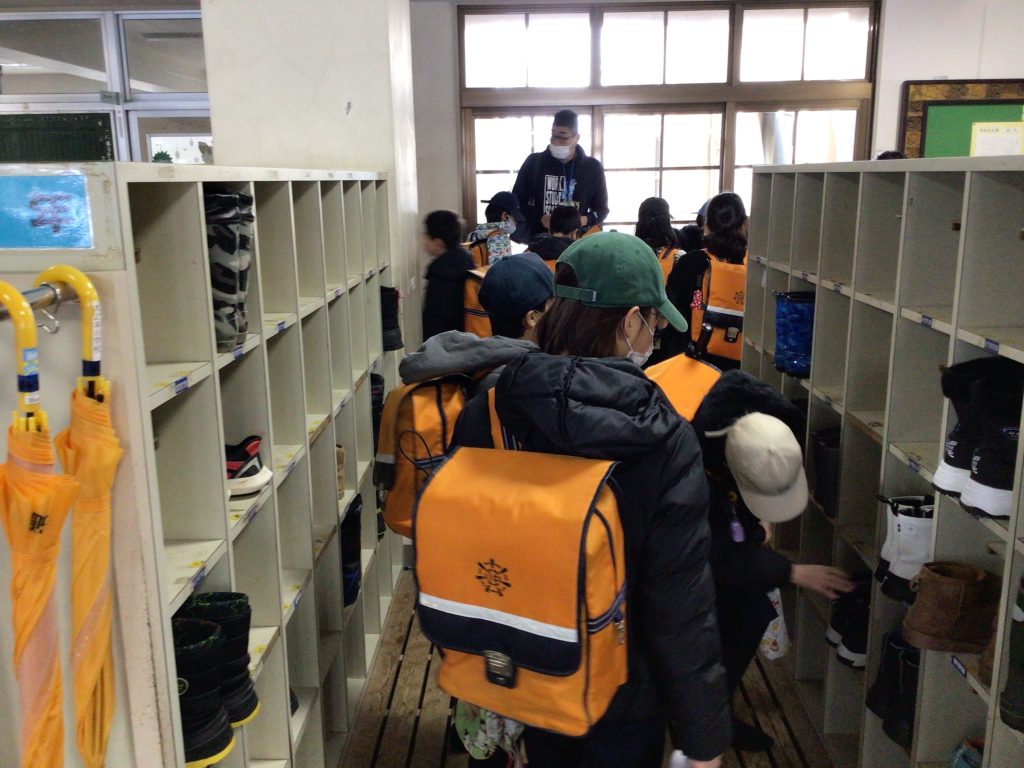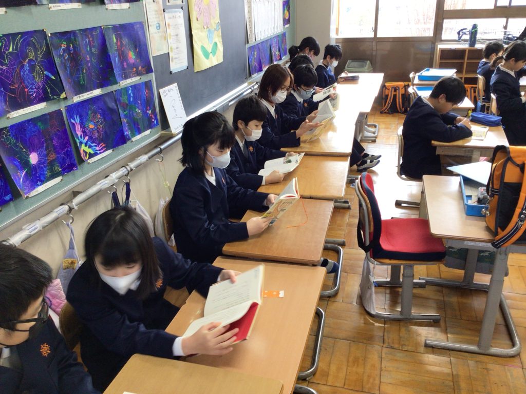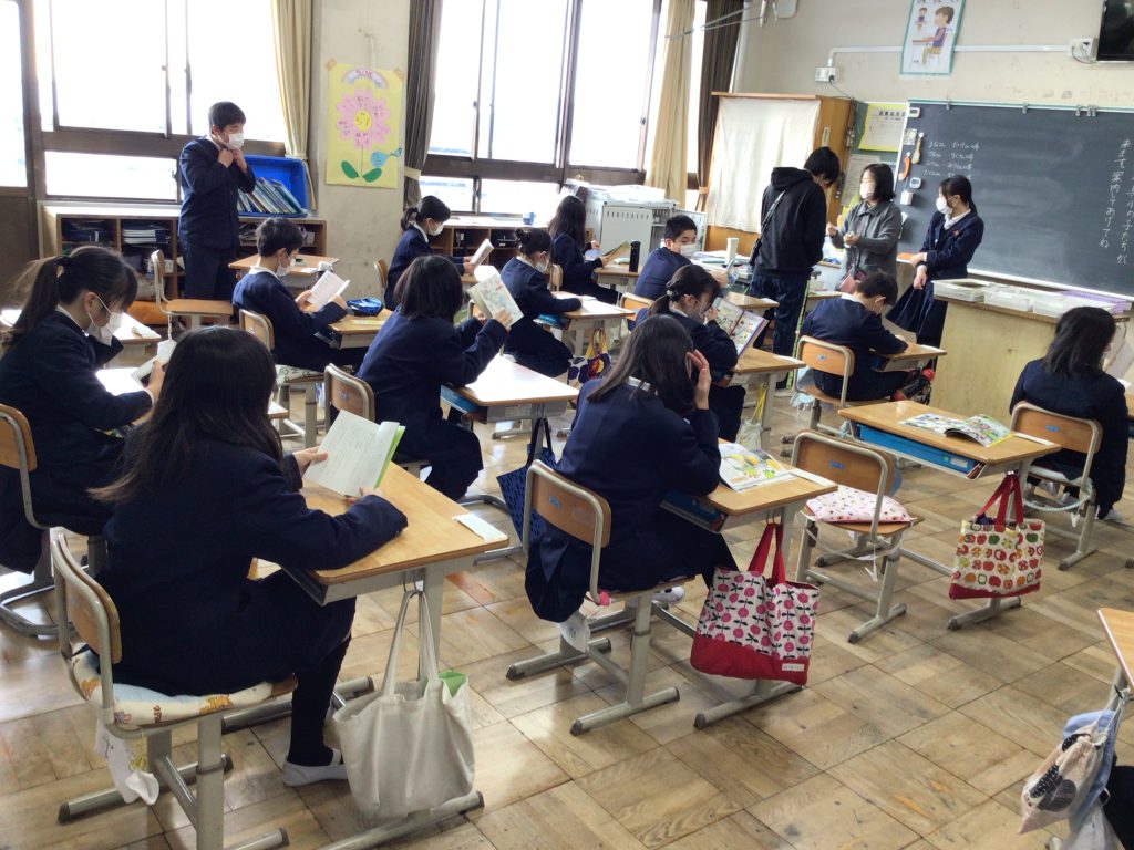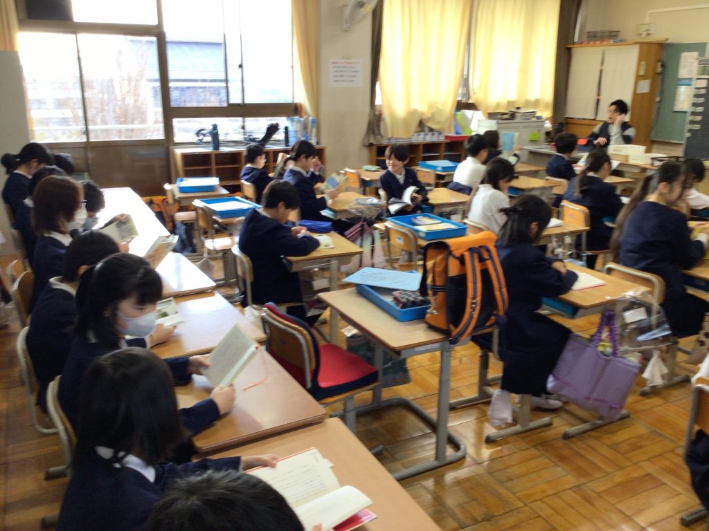 伊香具小学校の子どもたちは、2台のバスで木之本小学校まで登校し、読書タイムと朝の会を受けました。