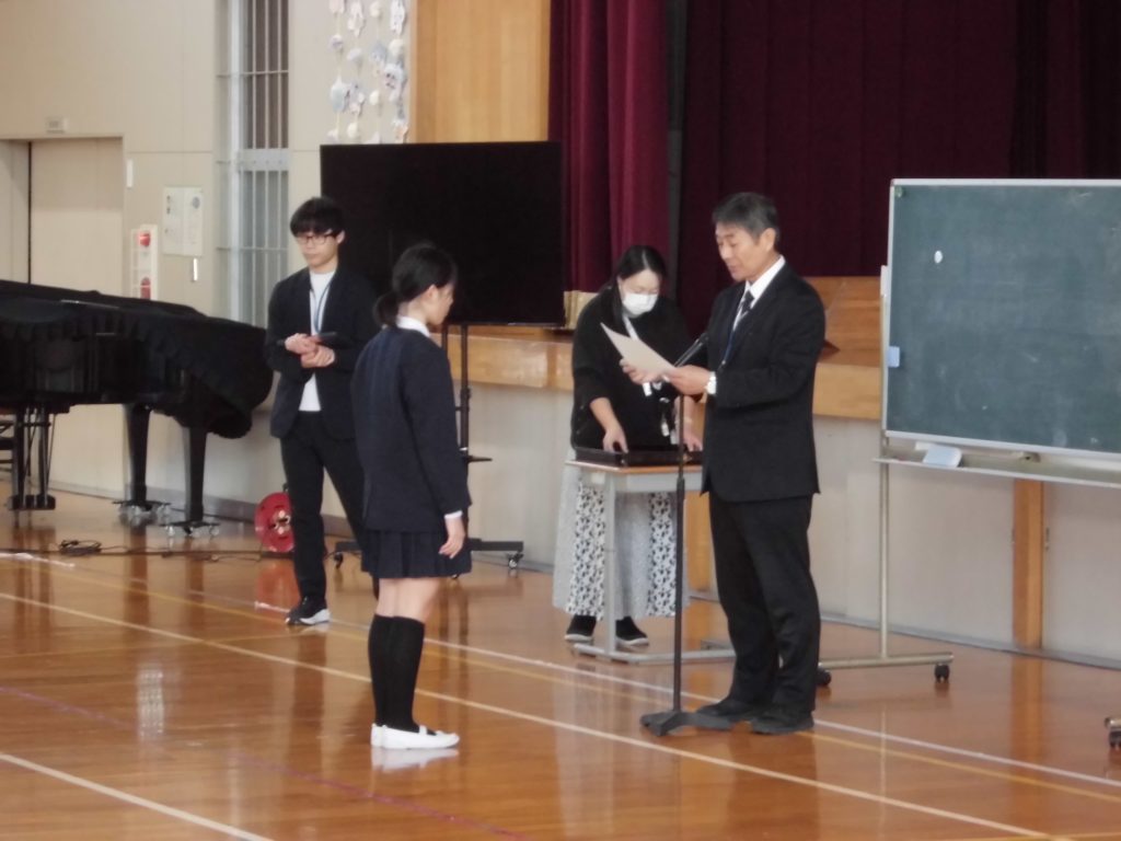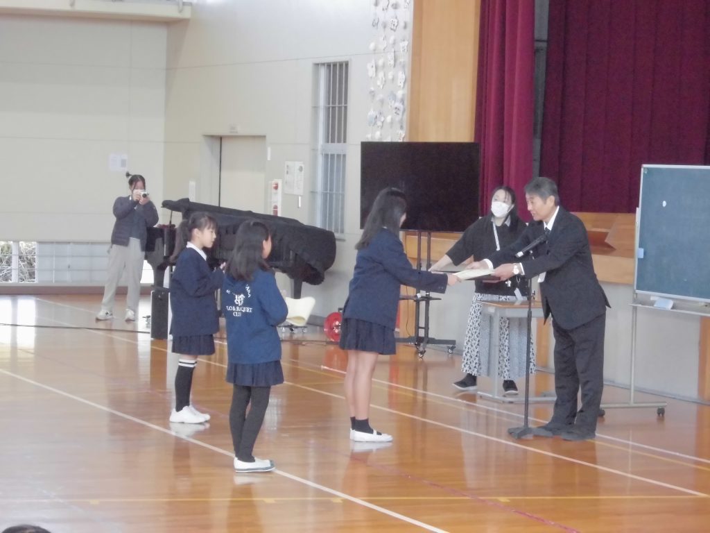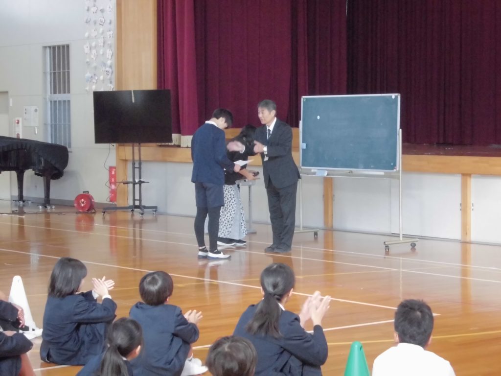 続いて、長浜市小学校陸上記録会、長浜市子ども美術展覧会、自主学習コンテスト、100文字作文の入賞者の表彰を行いました。入賞したみなさん、おめでとうございます!入賞できなかった人もよくがんばりました!