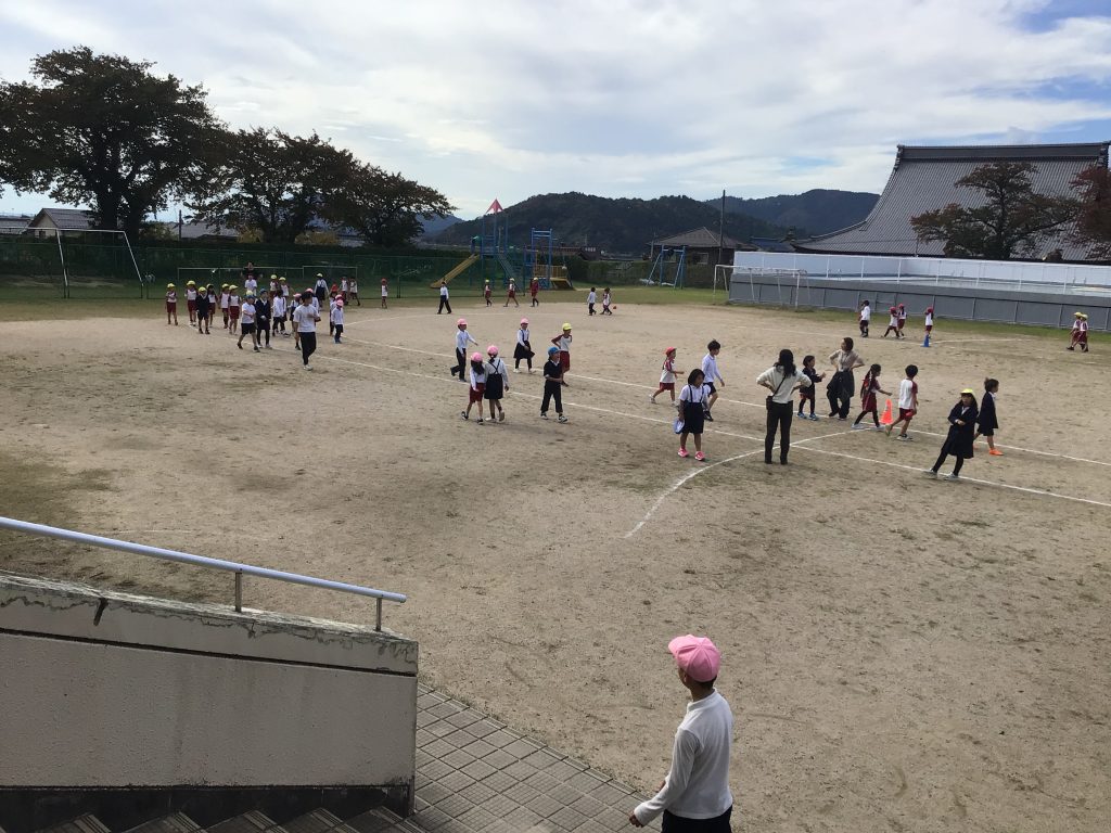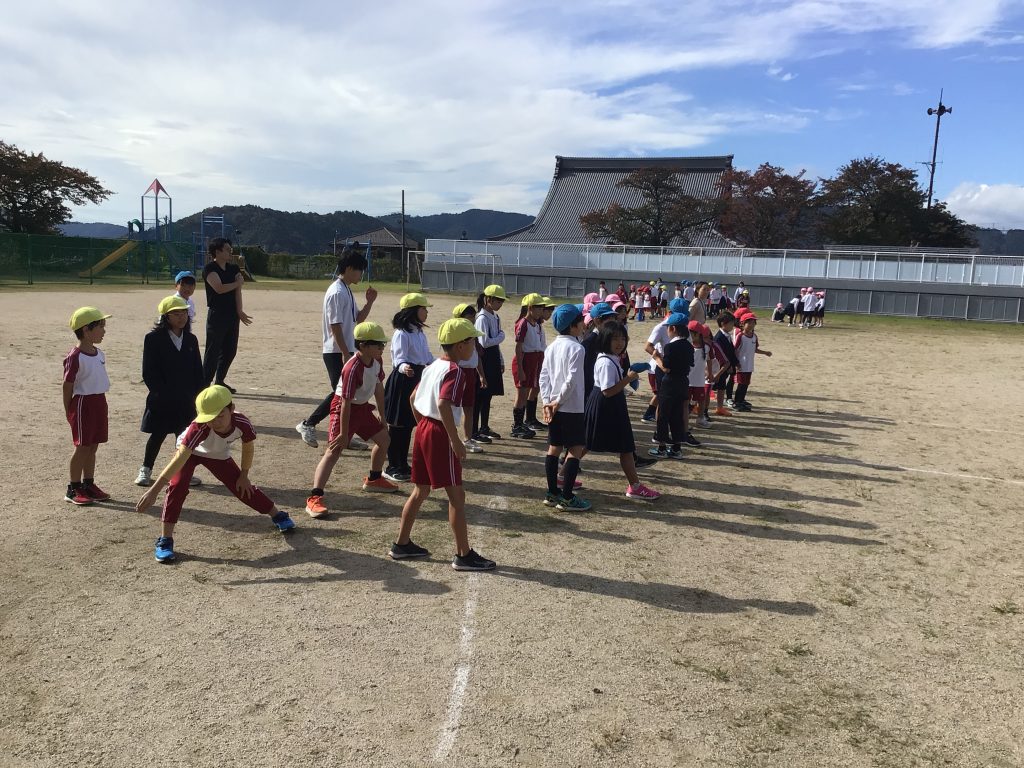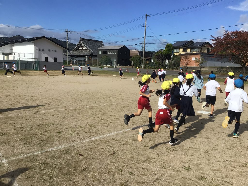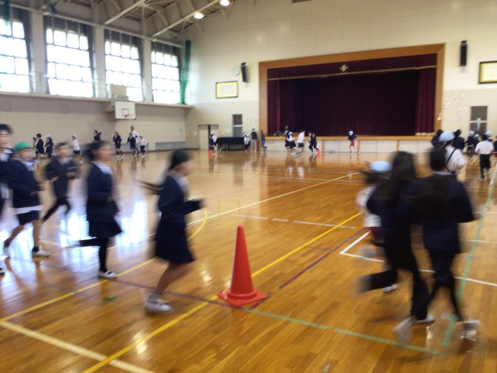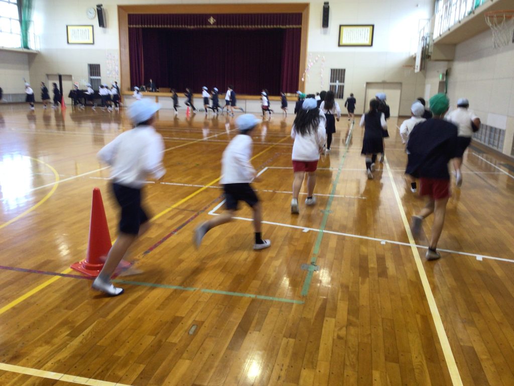 1年生から4年生まではグラウンド、5・6年生は体育館を走っています。